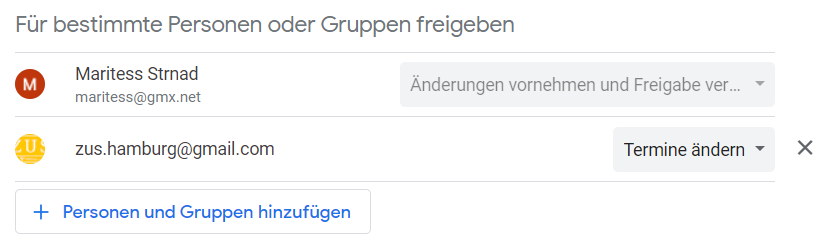 Für den neuen Kalender geht ihr nun den gleichen Weg (Freigeben für zu*********@***il.com) und wählt nun in der Freigabe die Berechtigung “Termine ändern” aus.