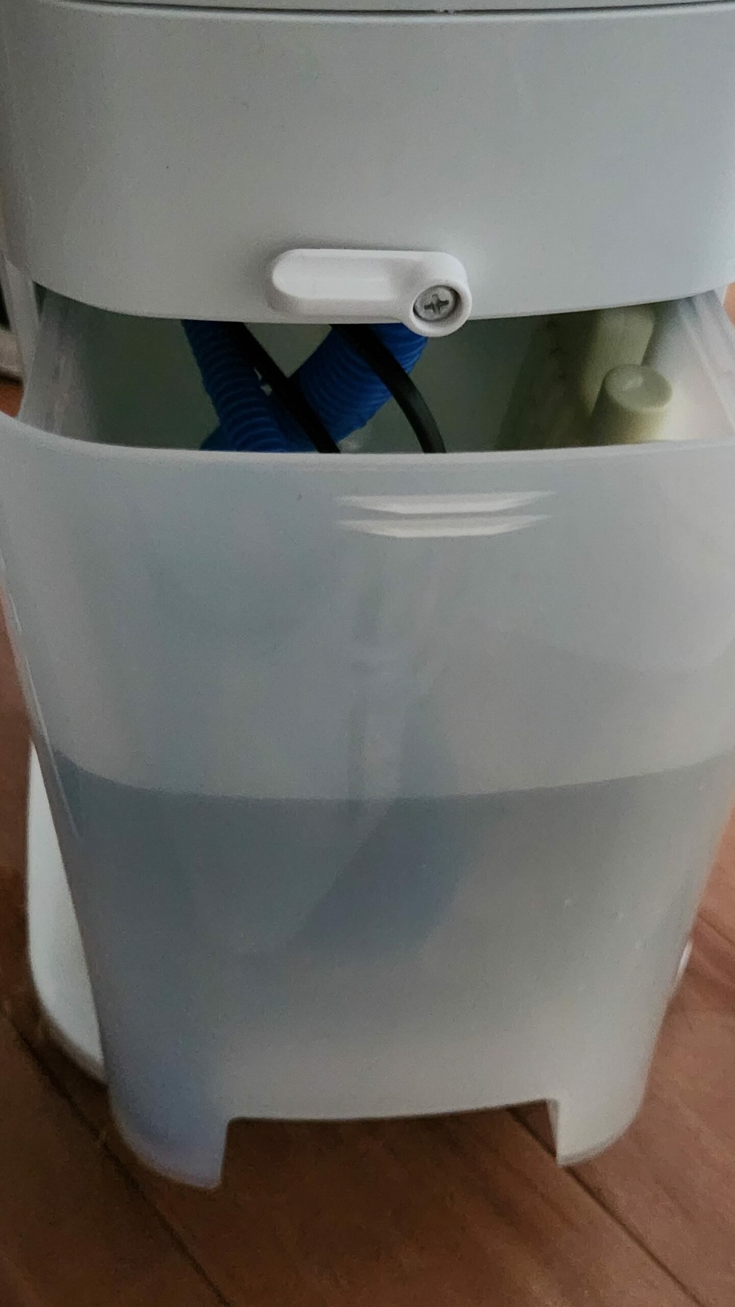 Im Teamraum ist für die heißen Sommertage ein Luftkühler angeschafft worden. Damit er funktioniert muss in den Tank auf der Rückseite kaltes Wasser eingefüllt werden. Um den Tank zu öffnen den Schieber horizontal stellen und den Tank etwas hinaus ziehen.