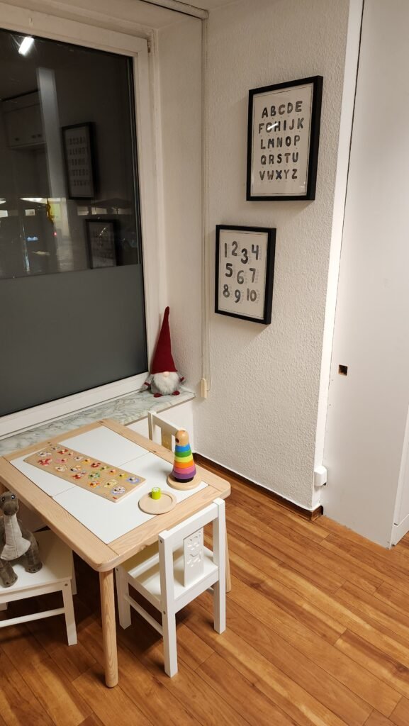 Marie und ich haben uns letzte Woche handwerklich betätigt. Heraus gekommen ist eine leichte Umgestaltung des Spielzimmers mit hölzernen Buchhaltern an der Wand und einer Lampe, damit es etwas gemütlicher ist. Außerdem haben wir die bisherigen Bilder umgehängt.